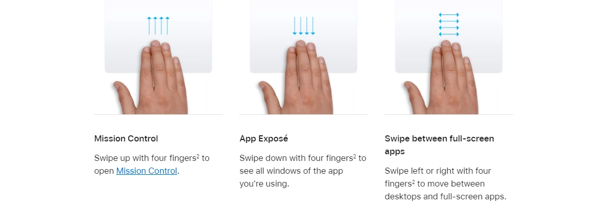 詳細を制御するには、高度なジェスチャーを使用してください。3本指のドラッグ:トラックパッドに3本の指をドラッグして、画面にアイテムを移動します。4本指のスワイプ:4本の指でスワイプして、ミッションコントロールを備えたすべてのオープンアプリを表示するか、左または右にスワイプしてフルスクリーンアプリを切り替えます。回転します:写真やドキュメントを回転させるために、ノブを回すなど、2本の指を互いに回します。