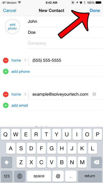 ステップ4:画面の上部にある名前のフィールドに連絡先の名前を入力し、タップします電話を追加しますボタンを追加して、電話番号を追加してから、下にスクロールして、連絡先に関する情報を追加のフィールドに入力します。タップすることができます終わり終了したら、画面の右上隅にあるボタン。