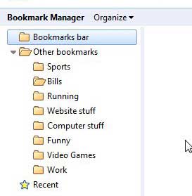 ウィンドウの左側の列には、いくつかのフォルダーがあります。そのコラムの上には、「ブックマークマネージャー」という言葉と、ドロップダウンメニューがあります。整理する。これは私たちが使用するツールです。
