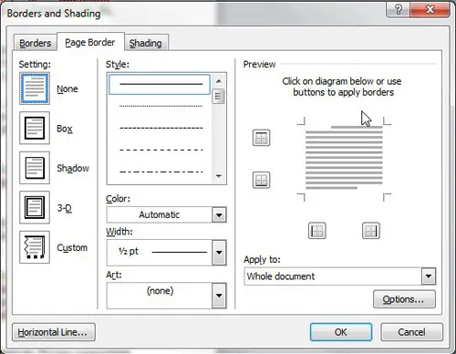 ステップ4 - クリックしますスタイル、色、幅そして美術窓の中央からのオプション。 Microsoft Wordドキュメント用のページ境界線を作成するために使用できる組み合わせの事実上無限の可能性があるため、最初のオプションを解決しないでください。ニーズに合ったオプションの組み合わせを見つけることができるはずです。