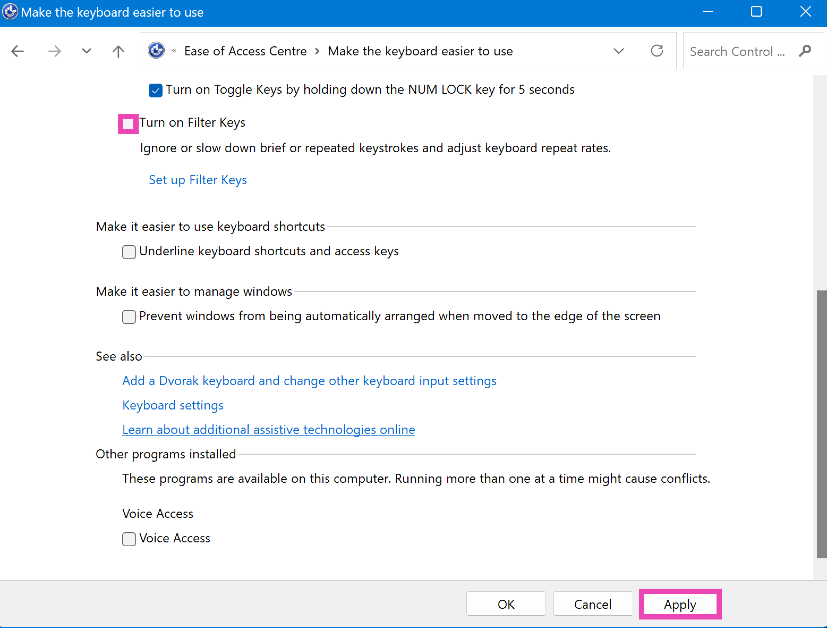 行きますコントロールパネル>アクセスのしやすさ>キーボードの仕組みを変更します、「フィルターキーをオンにする」を選択して、設定を適用します。