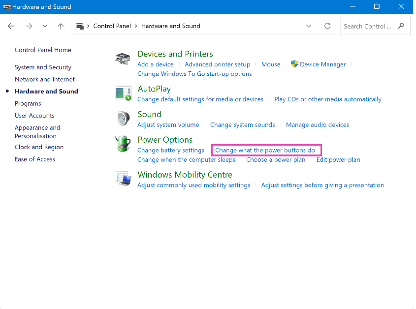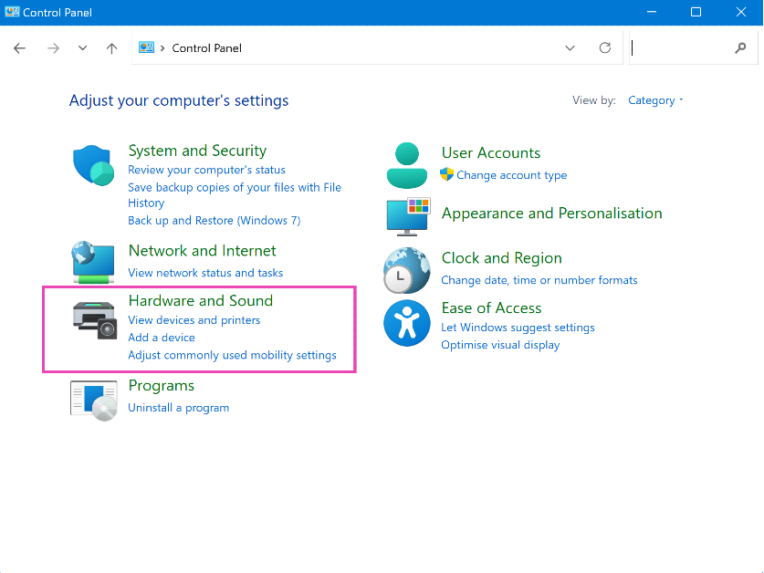ステップ1:起動しますコントロールパネル選択しますハードウェアとサウンド。
