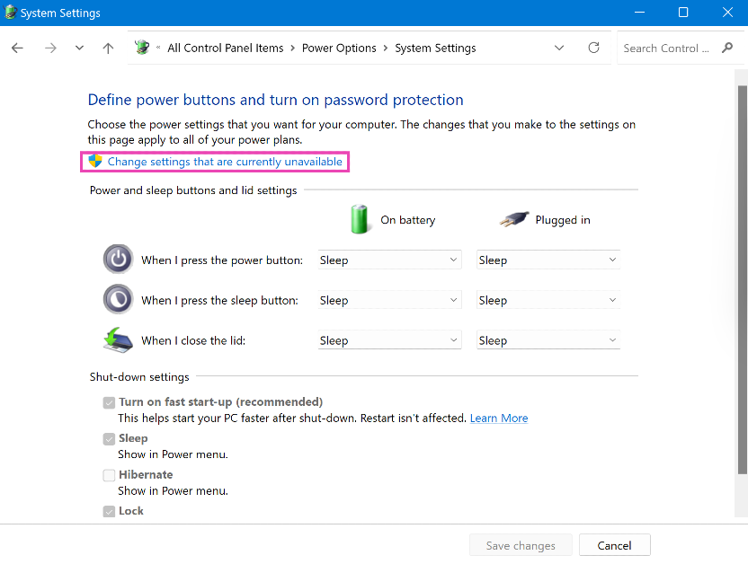ステップ4:クリックしてください現在利用できない設定を変更します。