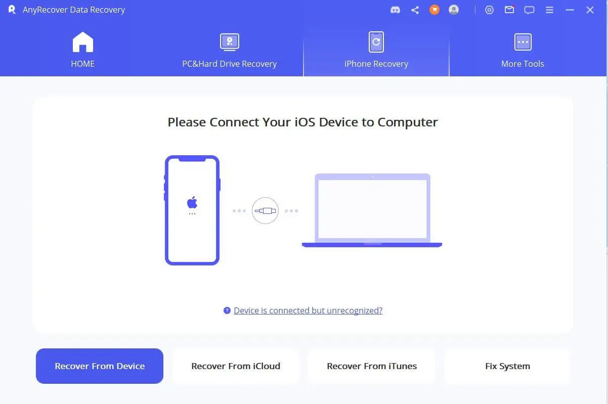 - 2. Recoverを開き、iPhoneをコンピューターに接続します。デバイスから回復を選択します