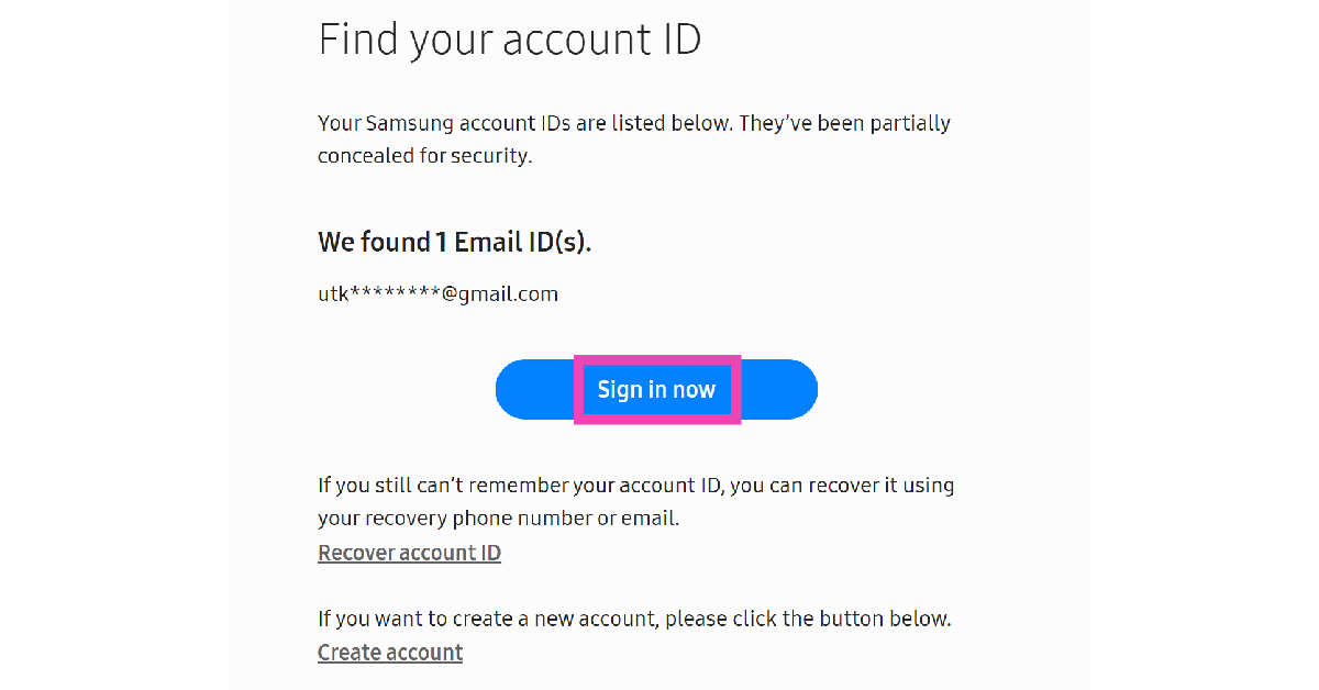 ステップ4:サムスンがあなたを展示します登録された電子メールID画面上。電子メールアドレスは、セキュリティ上の理由から部分的に隠されます。まだ登録されているメールを覚えていない場合は、クリックしてくださいアカウントIDを回復します。それ以外の場合は、クリックします今すぐサインインします。