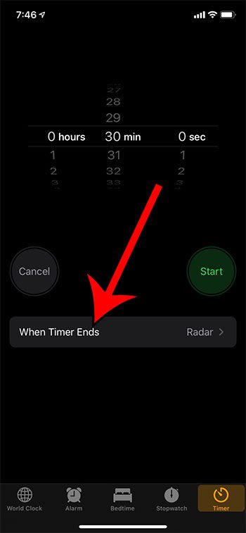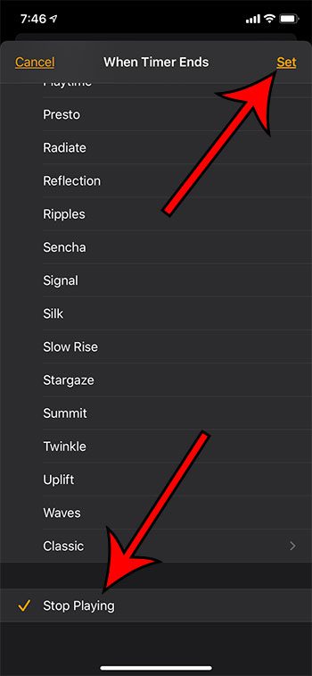 そのタイマーには、iPhoneでアイテムの再生を停止するオプションなど、本当に便利になる可能性のあるいくつかの追加の設定があります。これにより、iPhoneをスリープタイマーとして使用できます。上記の手順は、そのオプションを構成する方法を示しています。