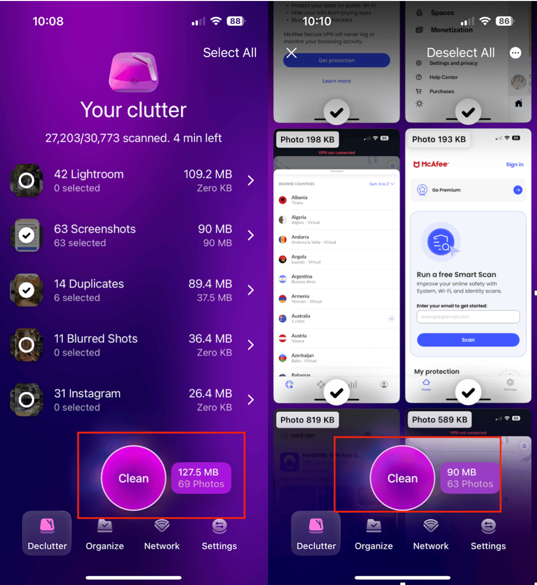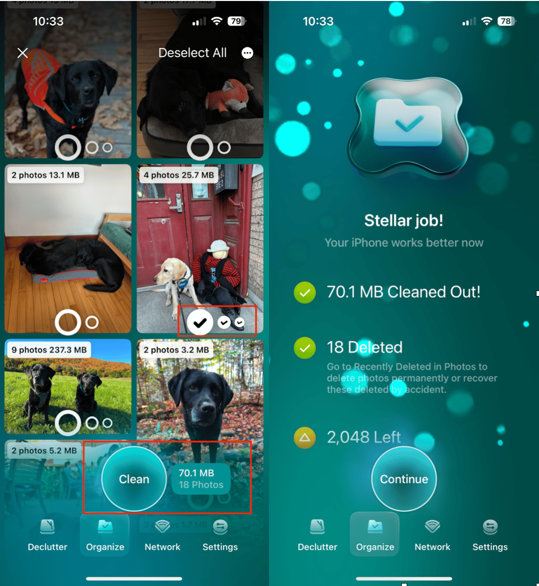 - レビューが終了したら、「Clean」をタップして選択した画像を削除し、「削除」をタップして選択を確認します。