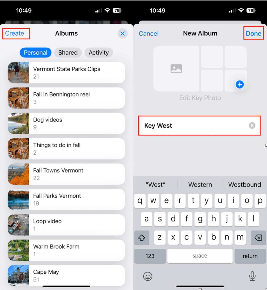 - 左上に「作成」をタップして、新しいアルバムまたはフォルダーを作成します。