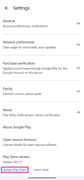 プレイストアを立ち上げ、プロフィール写真をタップして、設定>約、そして「更新プレイストア」をタップします。