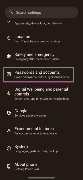 ステップ1:行きます設定選択しますパスワードとアカウント。