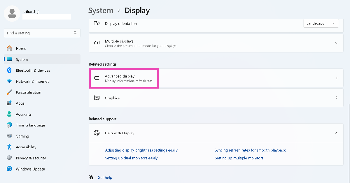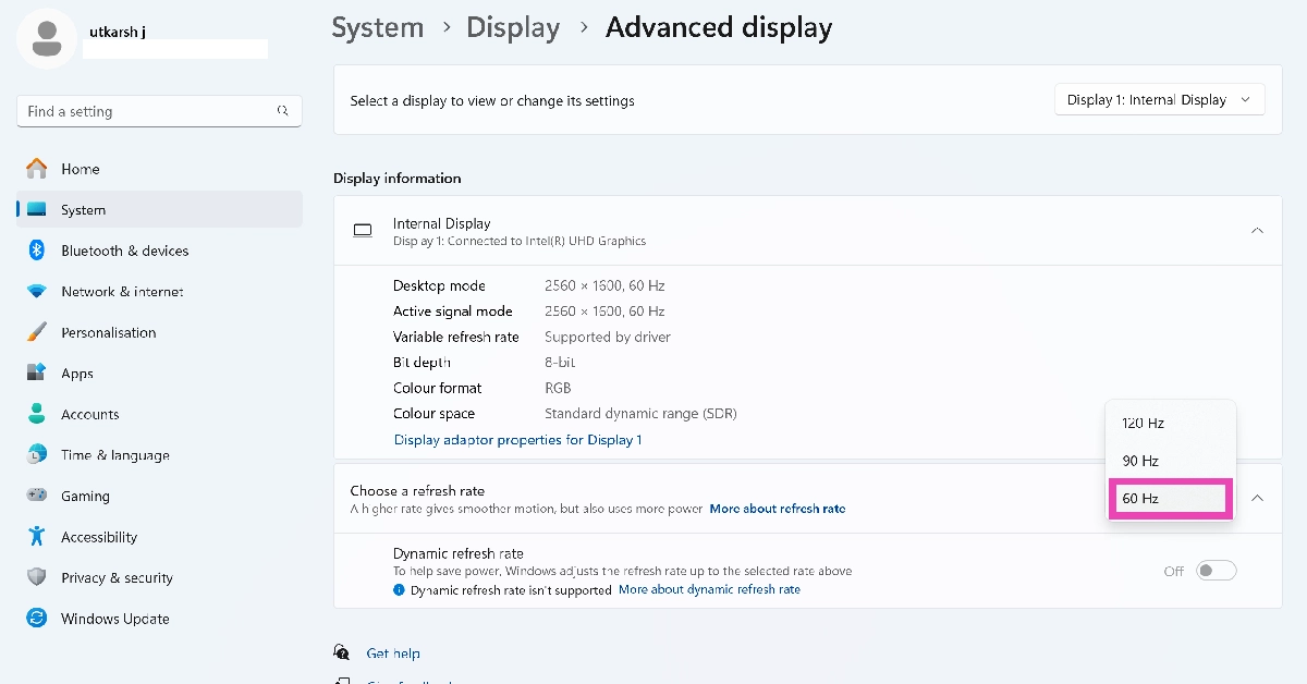 行きます[設定]> [システム]> [表示]> [詳細]ディスプレイ「リフレッシュレートを選択」の横にあるドロップダウンメニューを押して、選択します。