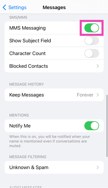 ステップ2:下にスクロールして、トグルスイッチをオンにしますMMSメッセージング。