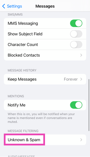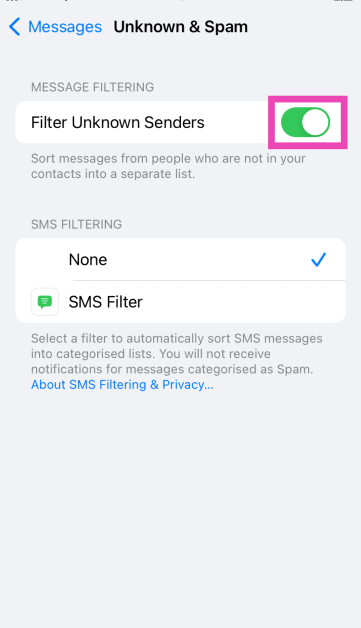 行きます設定>メッセージ>不明とスパムフィルター不明の送信者のトグルスイッチをオフにします。