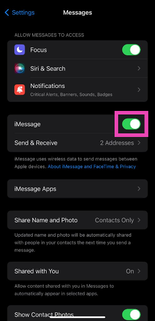 ステップ2:のトグルスイッチをオフにしますimessage。