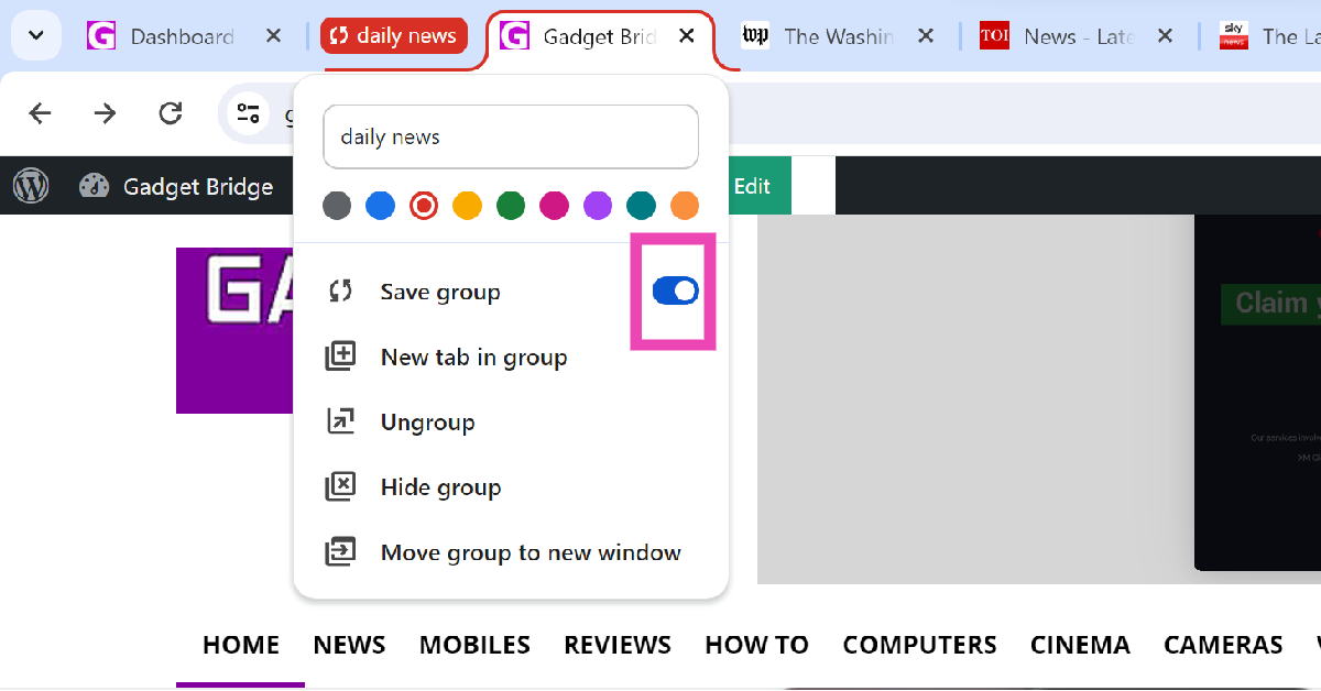 ステップ4:トグルスイッチをオンにしますグループを保存します。タブグループを保存すると、ブックマークバー。