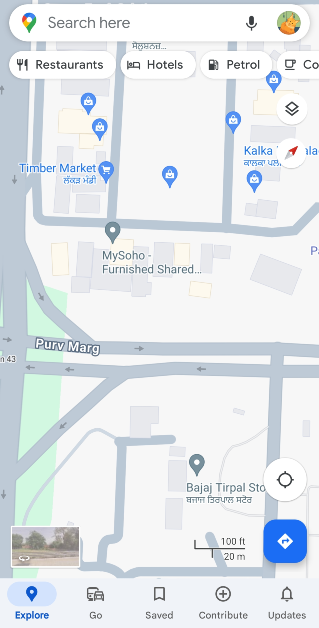 携帯電話でGoogle Mapsアプリを起動し、画面の左下のセクションに最近(AIM)ボタンを押します。マップ上の青い点は、現在の場所を示しています。