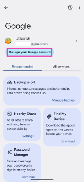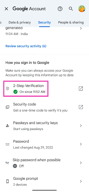 行きます設定> Google> Googleアカウントの管理>セキュリティ> 2因子検証[2因子検証]をオンにすることを選択します。