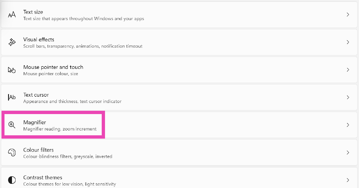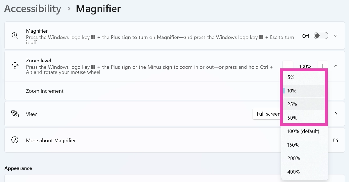 を押しますWindowsそして+キーを組み合わせて、PCの拡大鏡ツールをトリガーします。行くことにより、増分レベルを変更できます設定> Accessibilty> Magnifier。
