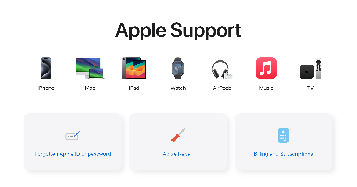 公式AppleサポートWebサイトサポートアプリと同様のエクスペリエンスを提供します。デバイスを選択して、それに直面している問題の種類を選択できます。近くのAppleが認可されたサービスセンターや天才バーを検索するオプションが与えられ、そこで予約を予約できます。また、現在Appleによって修理されているデバイスの修理ステータスを追跡することもできます。