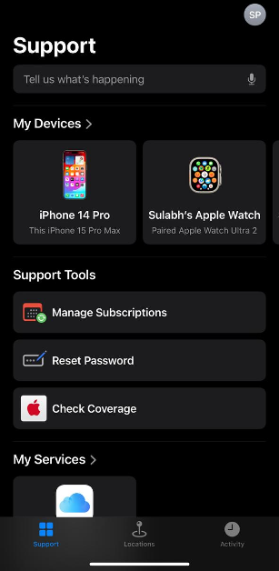 ステップ3:アプリのホームページには、現在使用しているデバイスが表示されます。 Appleアカウントに登録された別のデバイスのヘルプを求めたい場合は、タップしてください製品画面の左上隅に。