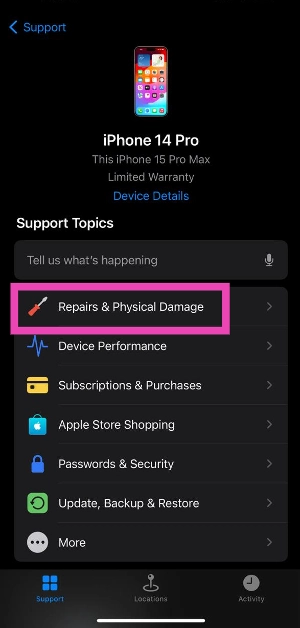 ステップ4:直面している問題に適合するオプションを選択します。損傷したデバイスを修復するためにAppleに手を差し伸べている場合は、ヒットします修理と物理的損害。