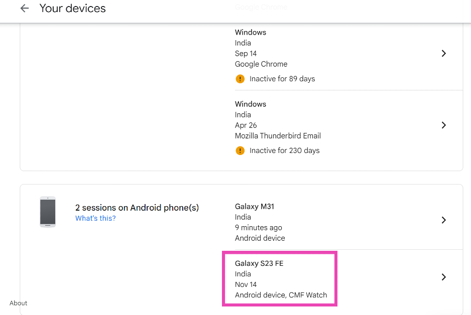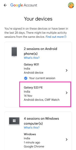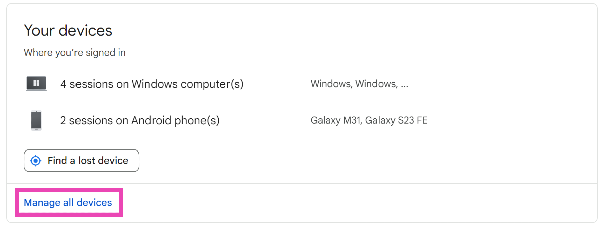 携帯電話が盗まれた場合は、PCのGoogleアカウントにログインして、プロフィール写真をクリックして選択しますGoogleアカウントを管理します。次に、に行きますセキュリティ>すべてのデバイスを管理しますAndroidスマートフォンからサインアウトします。