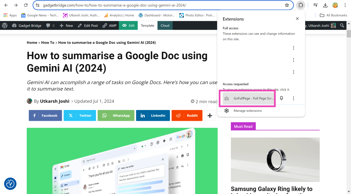 ステップ3:をクリックしますパズルアイコンアドレスバーの横に、GofullPage拡張子を選択します。