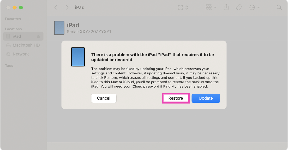 iPadをオフにし、USBケーブルを使用してiPadをPC/Macに接続し、上部ボタンを長時間押して回復モードにします。 iPadがリカバリモードになったら、Finder/iTunes/Appleデバイスに移動し、iPadを選択して「復元」を押します。