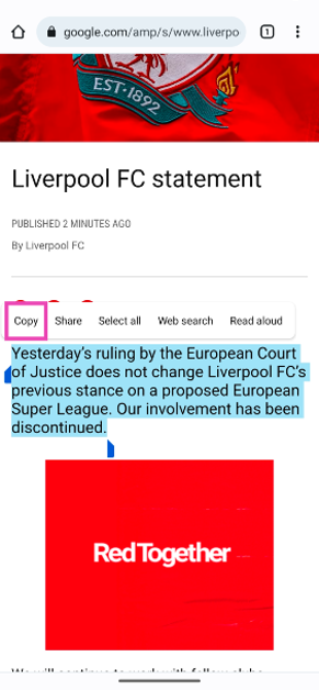 ステップ3:任意のテキストを長く押して選択しますコピー。