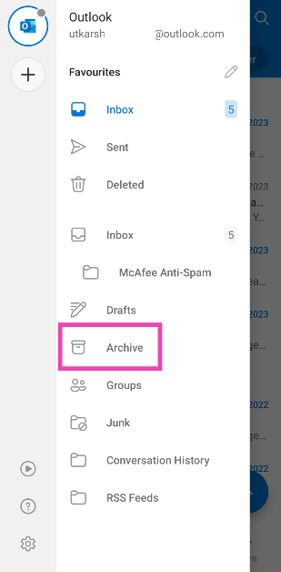 「アーカイブ」フォルダーは通常、左側のサイドバーにあります。 Windows Outlookアプリでは、フォルダーを表示するには、メールの横にある矢印アイコンをクリックする必要があります。 Androidユーザーは、画面の左上隅にあるプロファイルアイコンをタップしてアクセスする必要があります。