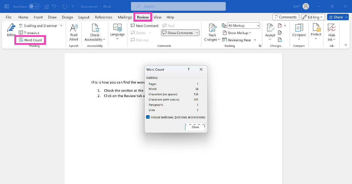 また、編集セクションの上の[レビュー]タブからMicrosoft Wordドキュメントの単語数を表示することもできます。 [レビュー]タブを押して、[Word Count]をクリックします。このオプションは、ドロップダウンメニューの左側にあります。このオプションをクリックすると、前の方法で言及されているような詳細な仕様が得られます。