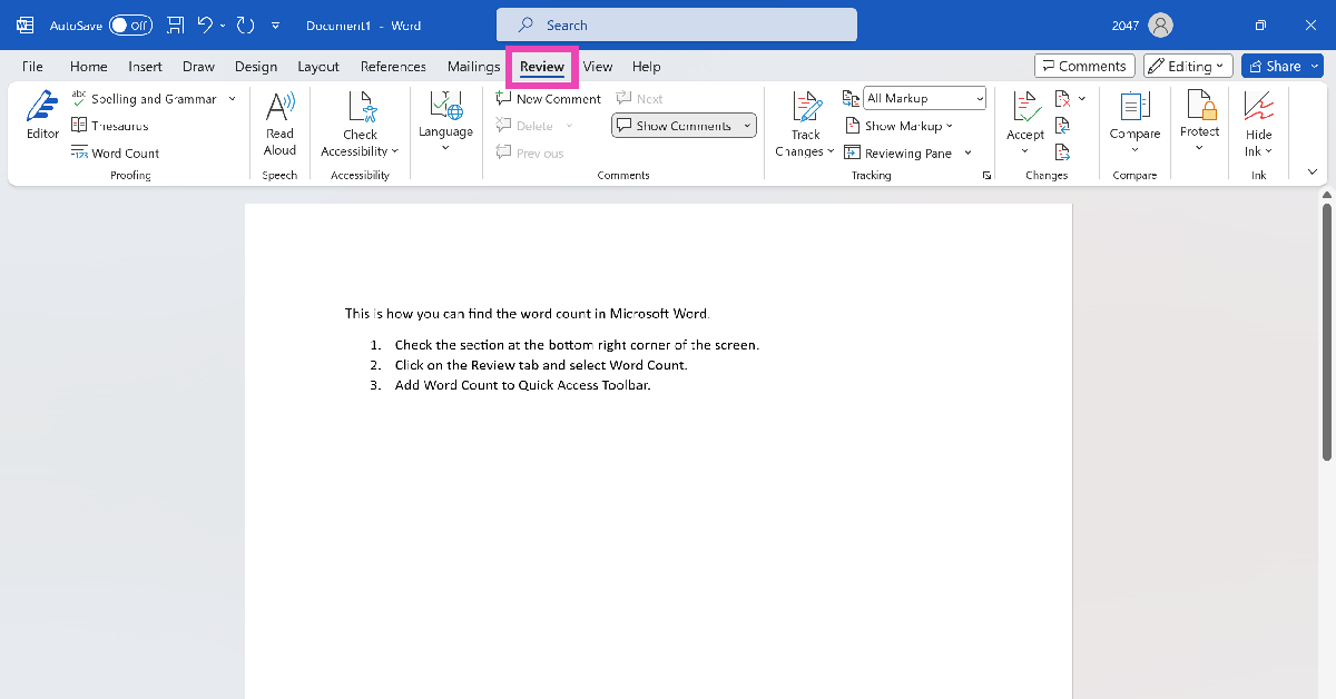 パッセージを強調し、プレスしますCtrl + Shift + gその中の単語の数を見つける。単語数は、画面の右下セクションにも表示されます。 [レビュー]タブから表示することもできます。