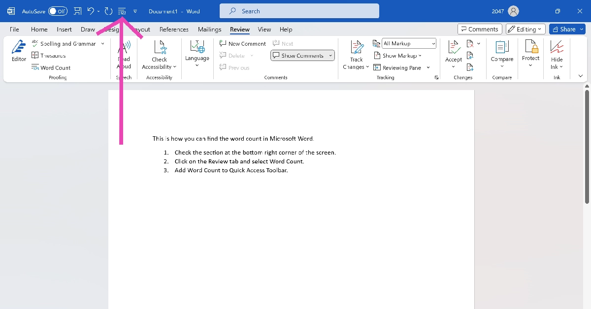 [レビュー]タブに移動し、単語数を右クリックして、選択しますクイックアクセスツールバーに追加します。