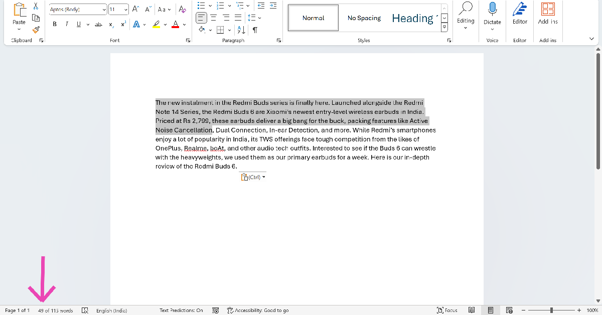 特定の行または段落の単語数を知りたい場合は、キーボードまたはマウスを使用して強調表示し、画面の下部にあるカウンターを確認してください。単語カウンターには、選択した単語の数と単語の総数が表示されます。このトリックは、テキストの特定のセクションのみをトリミングする場合に役立ちます。