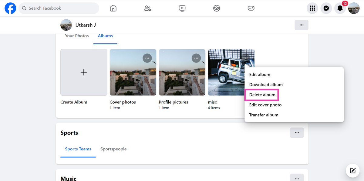 行きますプロフィール>写真、アルバムタブに切り替えて、削除するアルバムのエリップスをクリックして、「削除アルバム」を選択します。