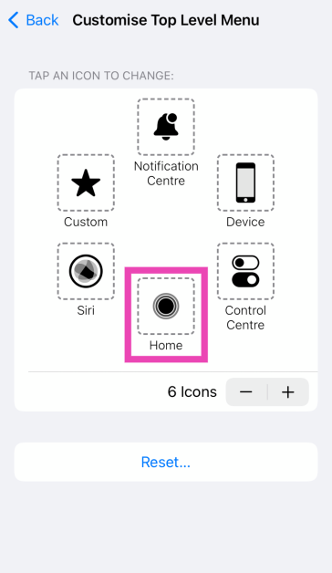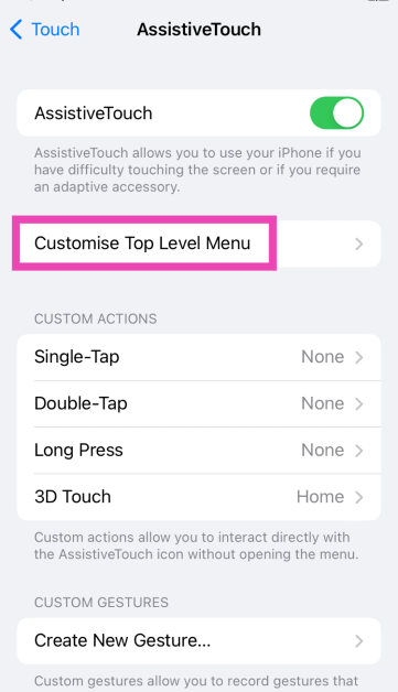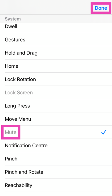 iPhoneのアクションキー/アラートスイッチが壊れている場合は、アシストタッチメニューにミュートオプションを追加できます。行きます設定>アクセシビリティ>タッチ>アシストタッチ>カスタムトップレベルメニュー、アクションを選択し、ミュートと交換します。