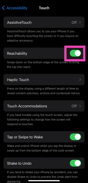 行きます設定>アクセシビリティ>タッチ到達可能性に隣接するトグルスイッチをオンにします。