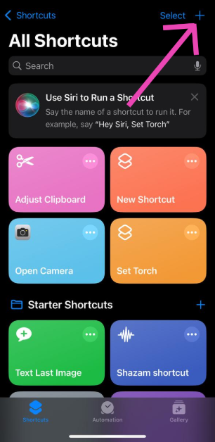 ステップ1: 打ち上げショートカットアプリそしてヒットしますプラスアイコン画面の右上隅に。