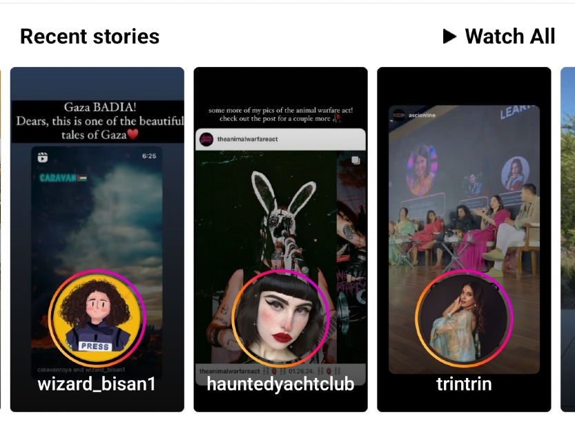 到達するまで自宅のフィードを下にスクロールしますストーリープレビューセクション。これには時間がかかる場合があります。プレビューサムネイルは、常にユーザーが投稿した最初のストーリーです。