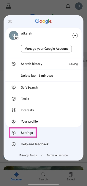 ステップ1:Googleアプリを開き、タップしますプロフィール写真、および選択します設定。