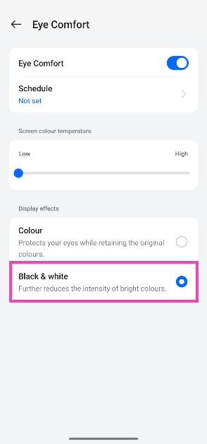 - 目の疲労を減らします:明るいビジュアルへの長期にわたる露出は、目に緊張しています。グレースケールモードをオンにすると、明るく鮮やかな色で目に引き起こされる疲労が減少する可能性があります。