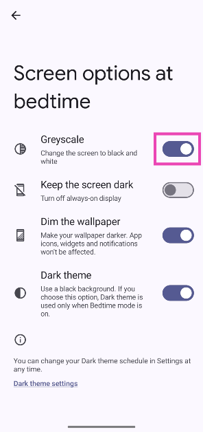 携帯電話のディスプレイをBlack&Wideに回すと、目への圧力が少なくなり、疲労が少なくなります。就寝前に携帯電話でグレースケールモードを使用することをお勧めします。