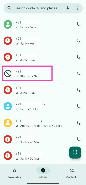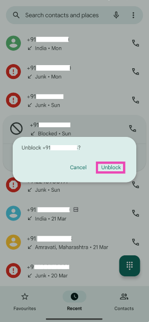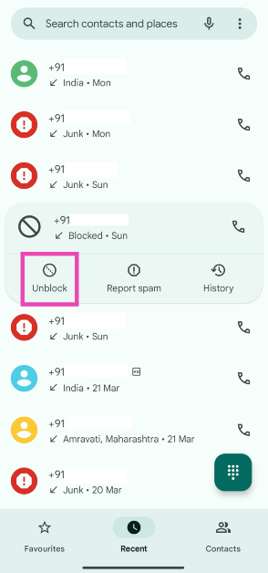 Googleのストックダイヤラーアプリを使用する場合は、「最近の呼び出し」リストのブロック番号を参照して、タップして「Unblock」を押します。