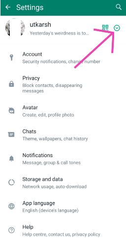 名前の横にある矢印アイコンを使用して、2つのアカウントを前後に切り替えることができます。電話番号でログインする代わりに、QRコードで携帯電話をセカンダリWhatsAppアカウントにリンクすることもできます。