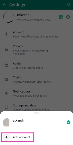 アプリ内のWhatsApp設定に移動し、名前の横にある下向きの矢印を押します。 [アカウントの追加]を選択します。登録された電話番号を使用してログインして、別のアカウントを設定するプロセスを実行する必要があります。また、他のWhatsAppアカウントのコンパニオンデバイスとして携帯電話を使用することもできます。