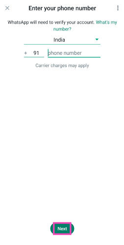 ステップ7:を入力します電話番号セカンダリWhatsAppアカウントに登録されています。