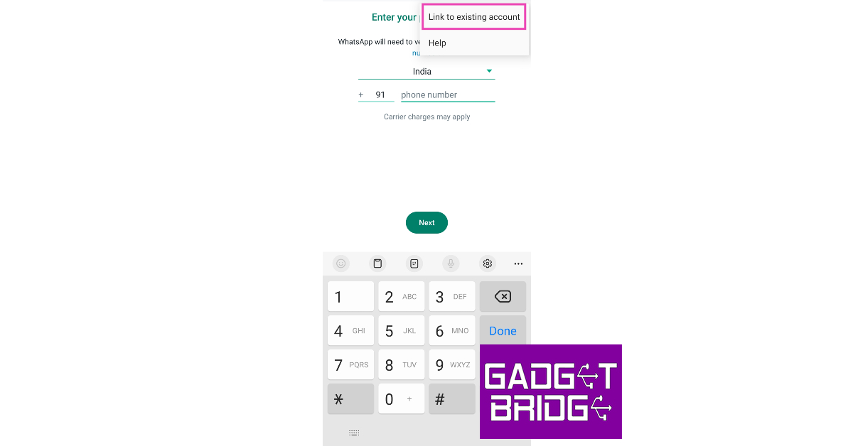 ステップ4:WhatsAppはあなたにあなたの番号を尋ねます。番号を入力する代わりに、画面の右上隅にある楕円をタップして選択します。既存のアカウントへのリンク'。これにより、プライマリデバイスのWhatsAppアプリを使用してスキャンする必要があるバーコードが生成されます。