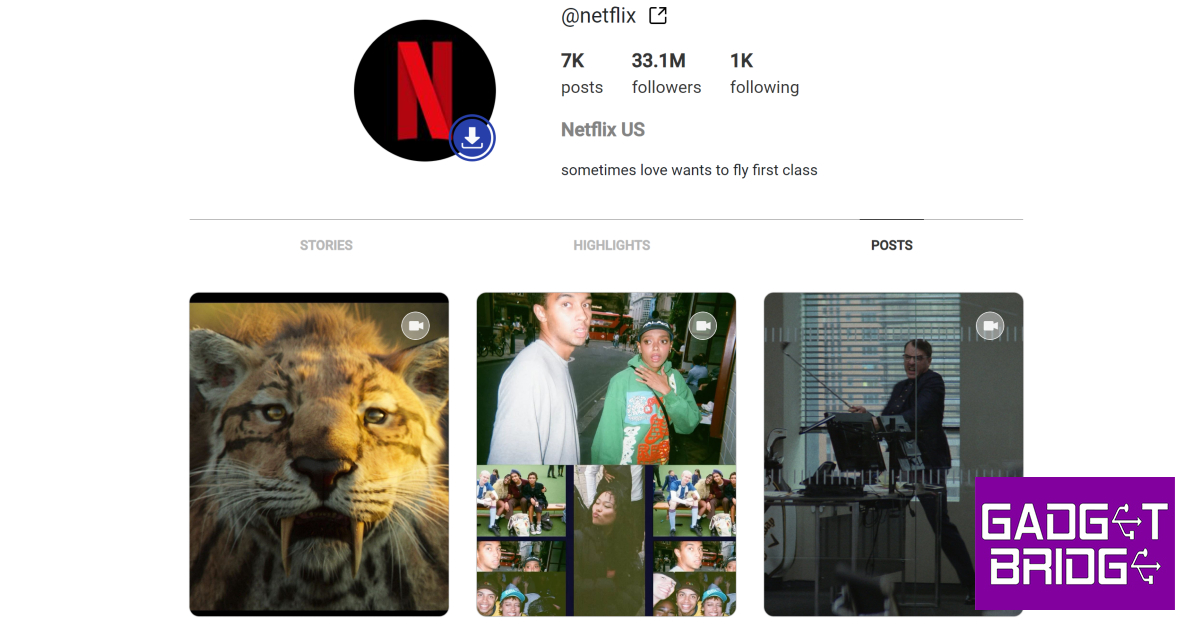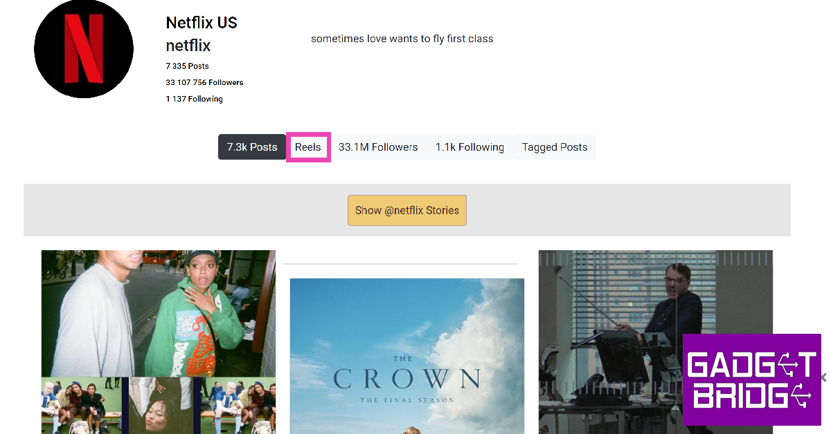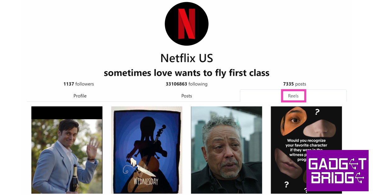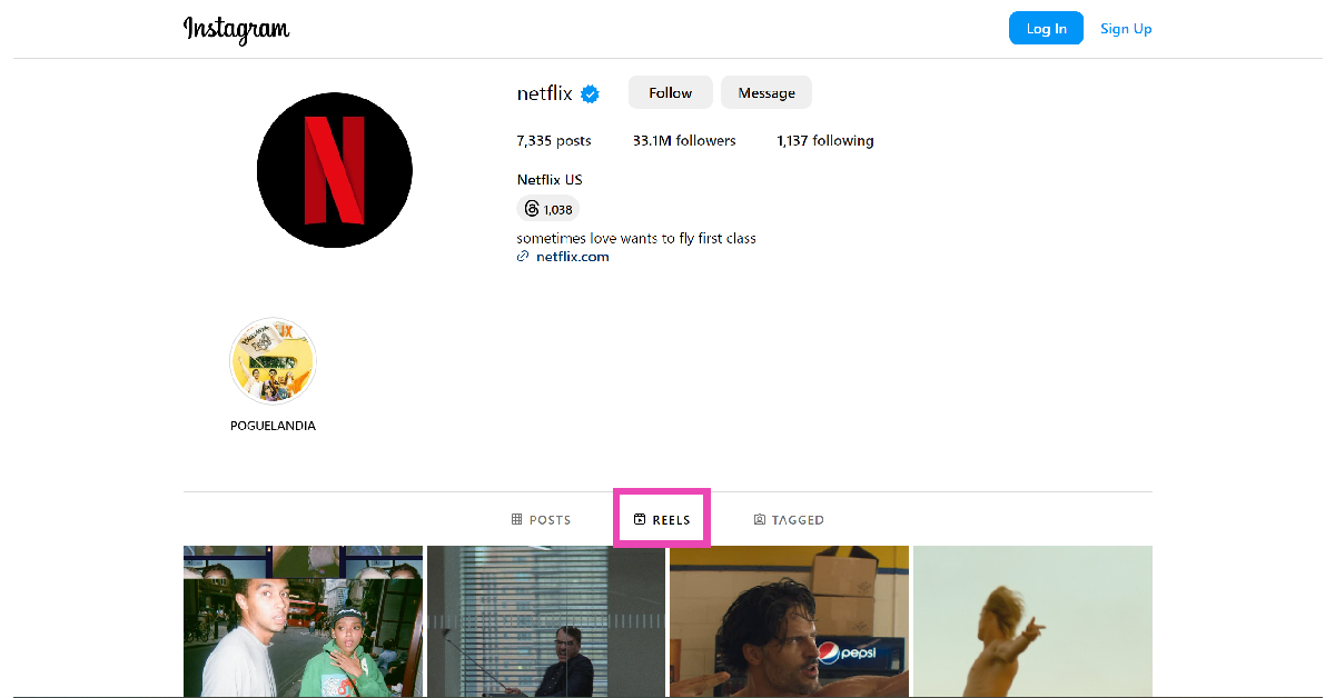 PC用のInstagramのWebサイトでは、アカウントにログインせずに投稿を表示してリールを視聴できます。パブリックプロファイルに投稿されたコンテンツは、プラットフォームにサインアップしていないユーザーが表示することもできます。特定のアカウントからリールを表示するには、そのユーザー名をInstagram URLに追加します「Enter」を押します。たとえば、Netflixが投稿したリールを表示する場合は、タイプhttps://www.instagram.com/netflix/URLボックスでヒットします入力。プロフィールに着地したら、[リール]タブに切り替えて、アカウントが投稿したすべてのリールを1か所に表示します。