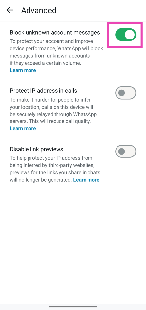 ステップ5:次のトグルスイッチをオンにします未知のアカウントメッセージをブロックします。