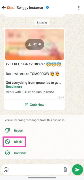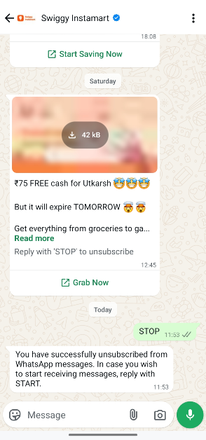 ステップ1:起動携帯電話のWhatsAppアプリとブランドから送信されたプロモーションメッセージを開きます。